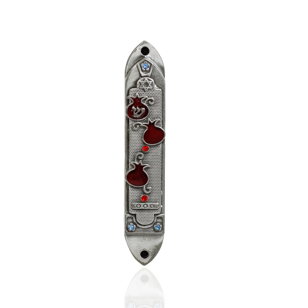 Pewter enameled Pomegranate with Blue and red and Blue Stones - Mezuzah (3.5 Inches with Scroll)