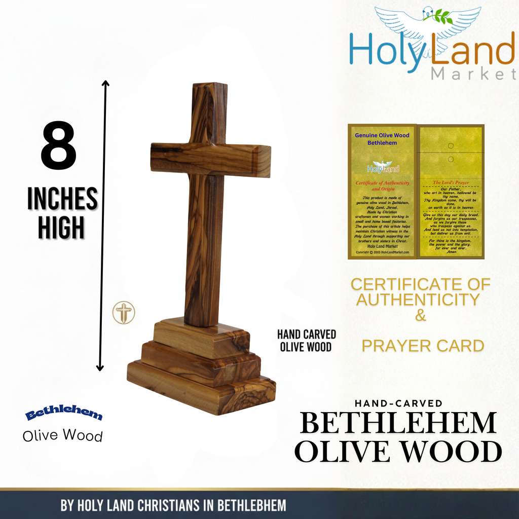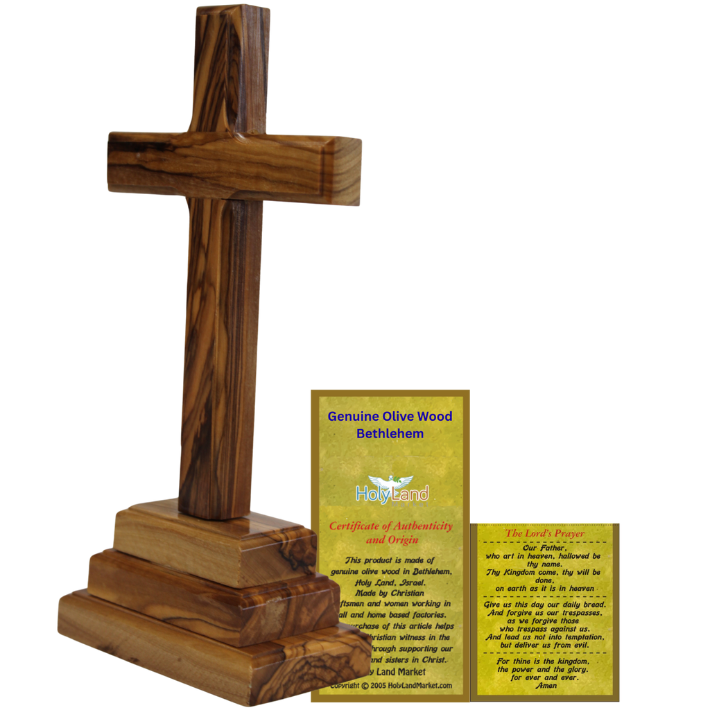 This handcrafted olive wood cross makes an uplifting gift for Christmas, Easter, Sacraments, housewarmings, pastors, ministries, and loved ones seeking a genuine Holy Land keepsake.