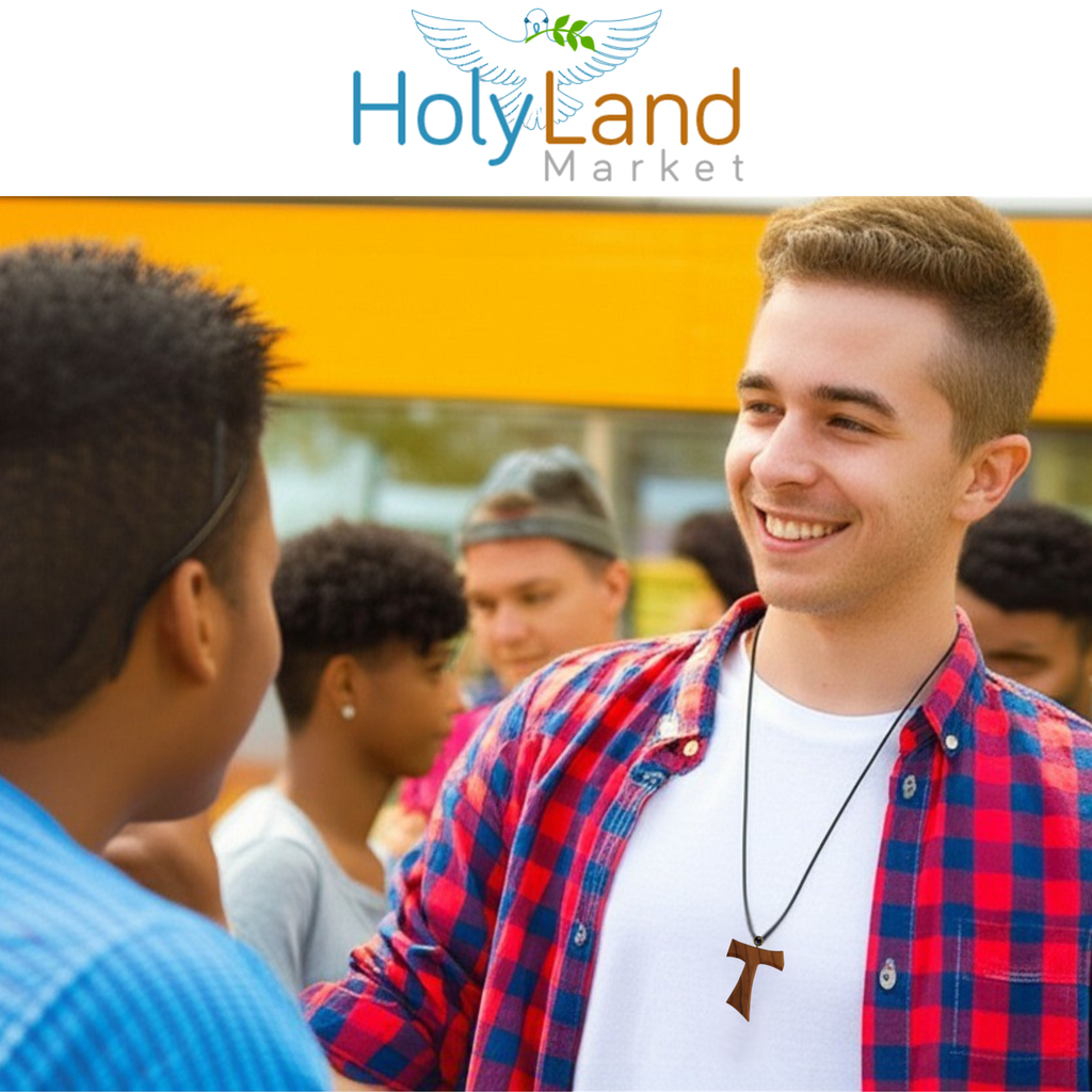 Holy Land Market Hand-Carved Olive Wood Tau Cross Necklace from Bethlehem – Made by Christian Artisans in the Holy Land, with Certificate of Authenticity & Lord’s Prayer Card – Wearable Pendant with 70cm Cord