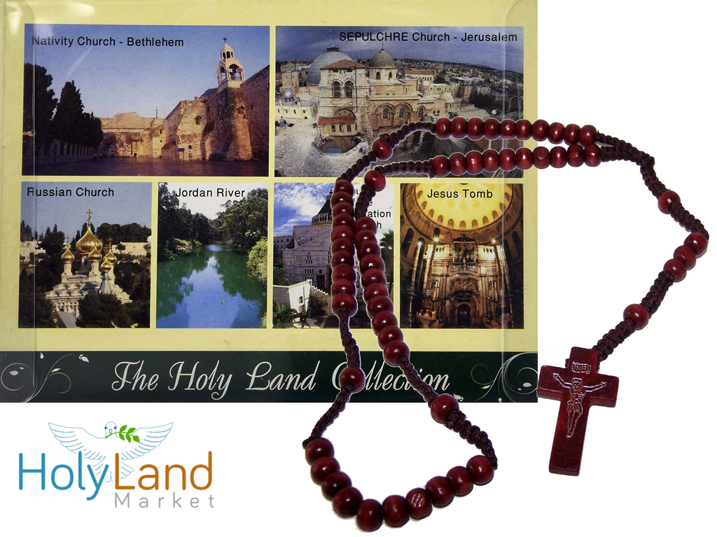 Holy Land Market Maroon Rosary plus Seven In One Holy Jordan Water, Soil, Oil Bottles, Olive Wood Cross, Incense, Candle & Icon Big Jerusalem Set from the Holy Land
