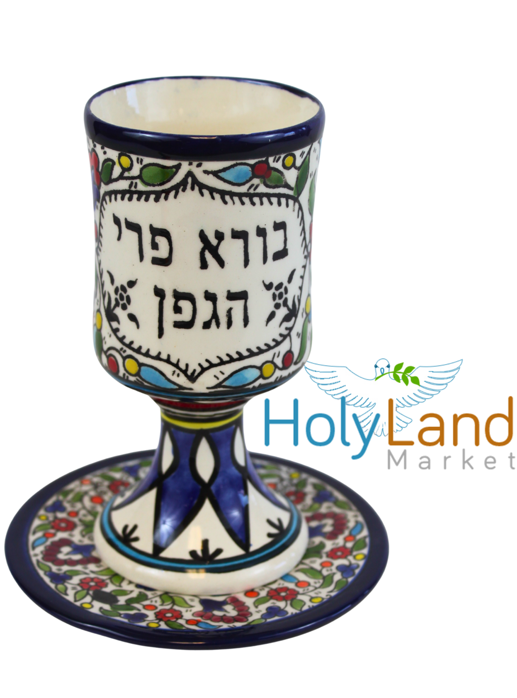 Holy Land Market Borei Pri Hagafen Ceramic Kiddush Cup & Plate for Shabbat/Seder - 5.5 in - Asfour Outlet