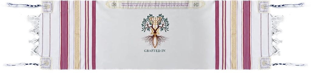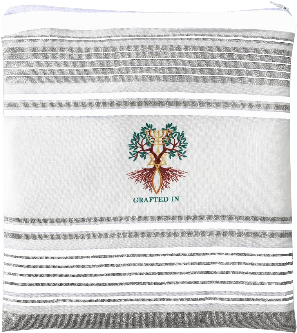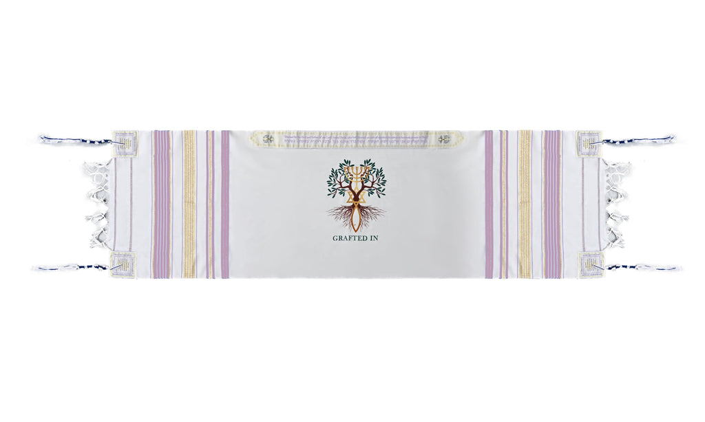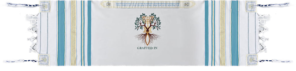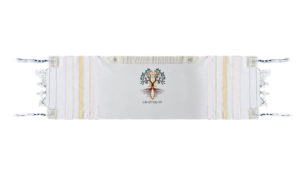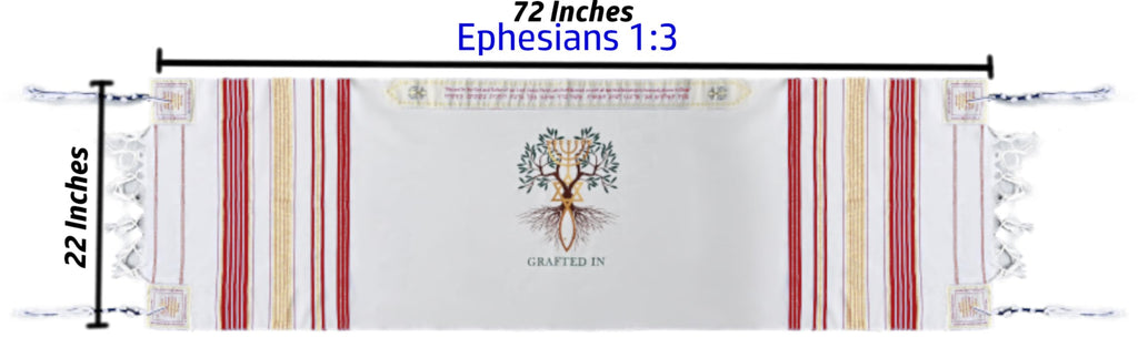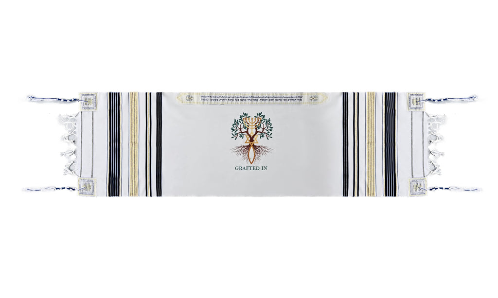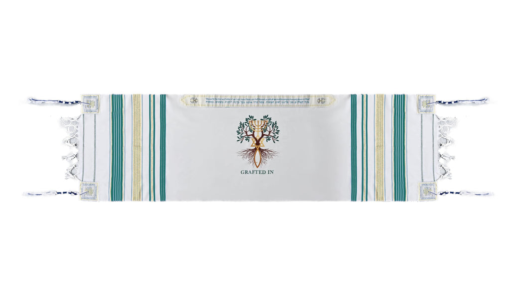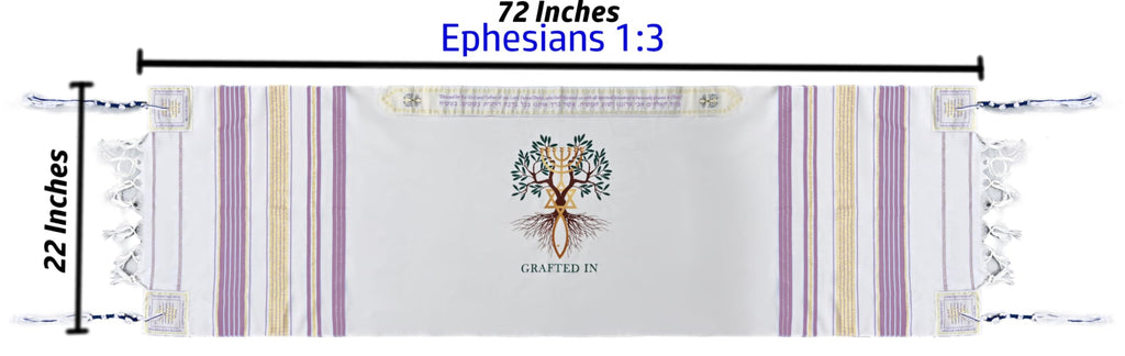 In the context of Messianic Judaism, the term "Grafted In" often refers to the belief that non-Jewish followers of Jesus (Yeshua) are spiritually "grafted in" to the olive tree of Israel, symbolizing their adoption into the covenant promises given to the Jewish people. This concept is derived from passages in the New Testament, particularly in the writings of the apostle Paul in the book of Romans. The imagery of being grafted into the olive tree is used to illustrate the unity and connection between Jewish and Gentile believers in the Messiah. It emphasizes the idea that through faith in Jesus, non-Jewish individuals become partakers of the blessings and promises of God that were initially given to the Jewish people. The term "Grafted In Messianic" refer to a branch of Messianic Judaism that specifically emphasizes this concept of spiritual adoption and the unity of Jewish and Gentile believers in the Messiah. Followers of this belief system often seek to honor Jewish traditions and customs while also embracing their faith in Yeshua as the Messiah. Corners ( English and Hebrew on Tallit ): Genesis 1:1 "In the beginning God created the heaven and the earth" (Gen. 1:1 KJV) John 1:1 "In the beginning was the Word, and the Word was with God, and the Word was God" (Jn. 1:1 KJV) Isaiah 65:17 "For, behold, I create new heavens and a new earth: and the former shall not be remembered, nor come into mind" (Isa. 65:17 KJV) Revelation 21:1 "And I saw a new heaven and a new earth: for the first heaven and the first earth were passed away; and there was no more sea." (Rev. 21:1 KJV) Blessing - Atara Neck / Head Piece ( English and Hebrew on Tallit ): "Blessed be the God and Father of our Lord Jesus Christ, who hath blessed us with all spiritual blessings in heavenly places in Christ" (Eph. 1:3 KJV) © ©, © ª ª ©, © Grafted IN - Romans 11:11-31 contains profound insights into God's mercy, plan of salvation, and the relationship between Jews and Gentiles in the context of faith. Here are some inspiring words based on this passage: God's plan of salvation includes both Jews and Gentiles, extending His mercy to all who believe in Him.