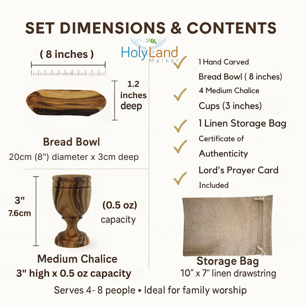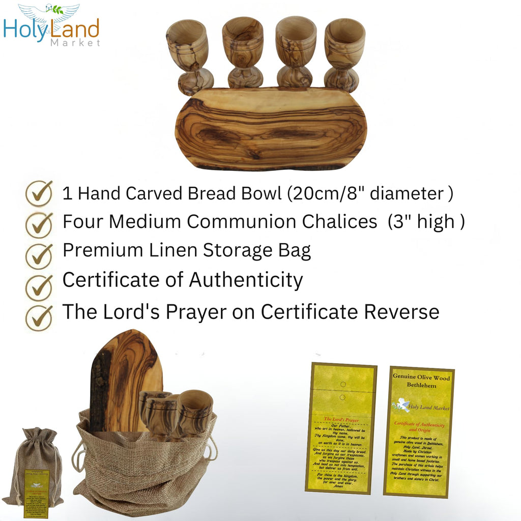 - COMPLETE BETHLEHEM COMMUNION SET FOR FAMILIES - Hand carved by Christian artisans in Bethlehem from authentic Jerusalem olive wood. Set includes 1 beautiful oval bread bowl (20cm/8" diameter) and 4 traditional medium chalice cups (3" height, 0.5 oz capacity). Perfect size for family worship, small church services, or intimate Bible study groups serving 4-8 people.