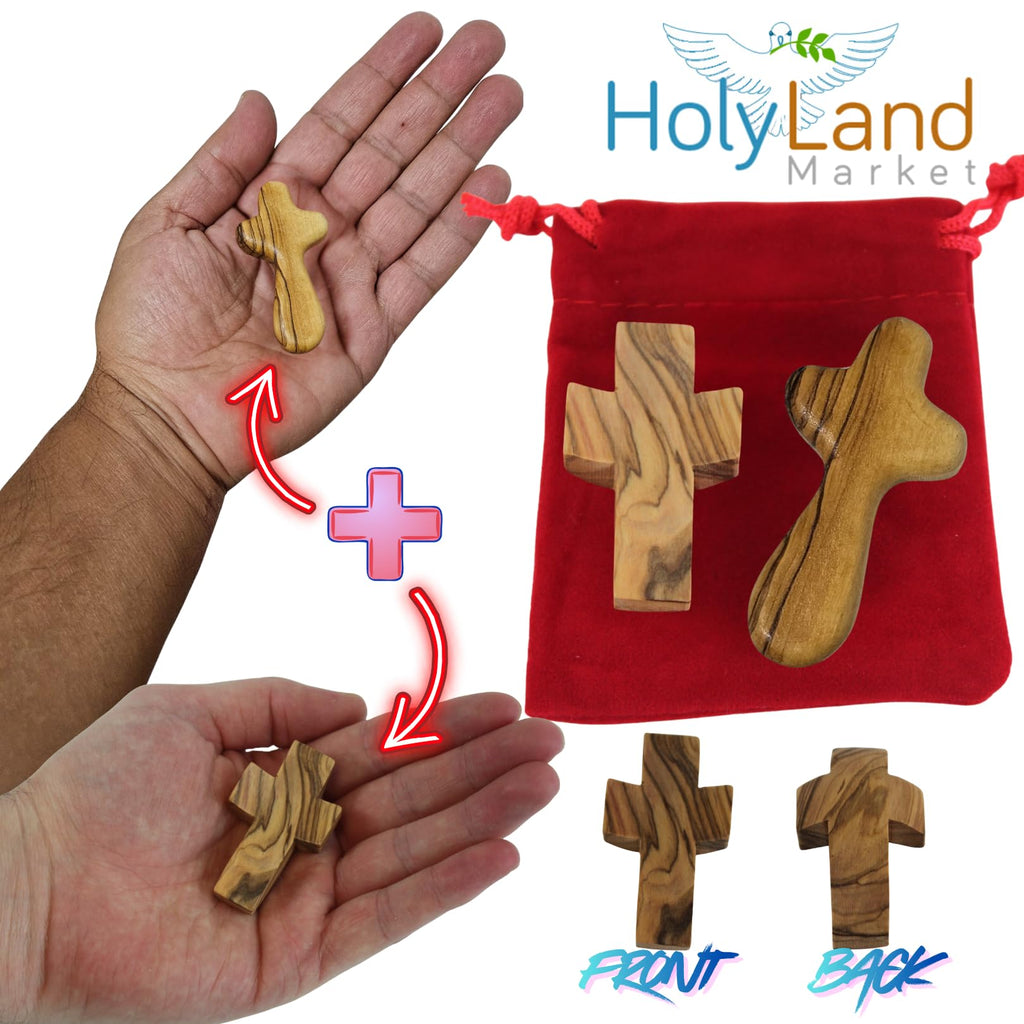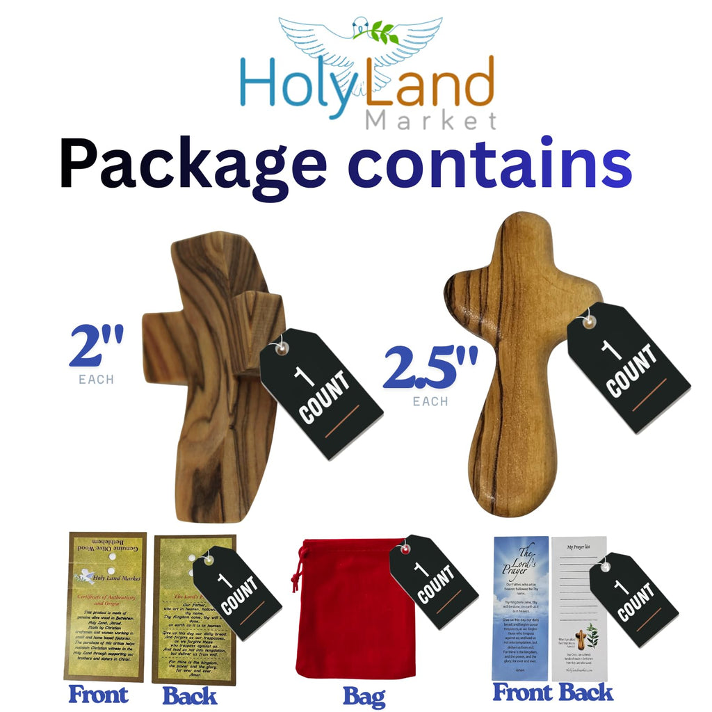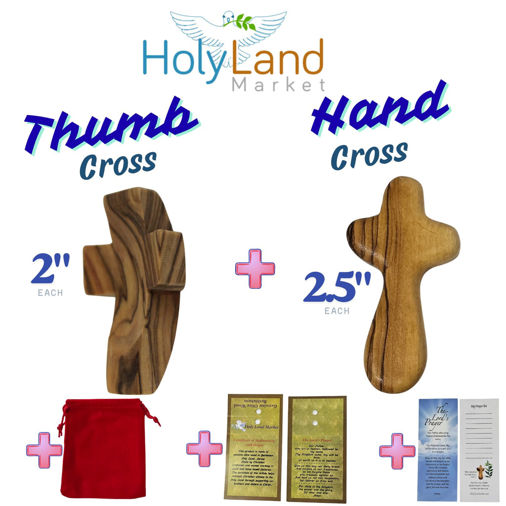 Holy Land Market Hand Carved Olive Wood Comfort Set – Made by Christian Artisans in Bethlehem – 2” Thumb & 2.5” Holding Crosses with Velvet Bag, Certificates & Prayer Cards – Authentic Holy Land Faith Gift