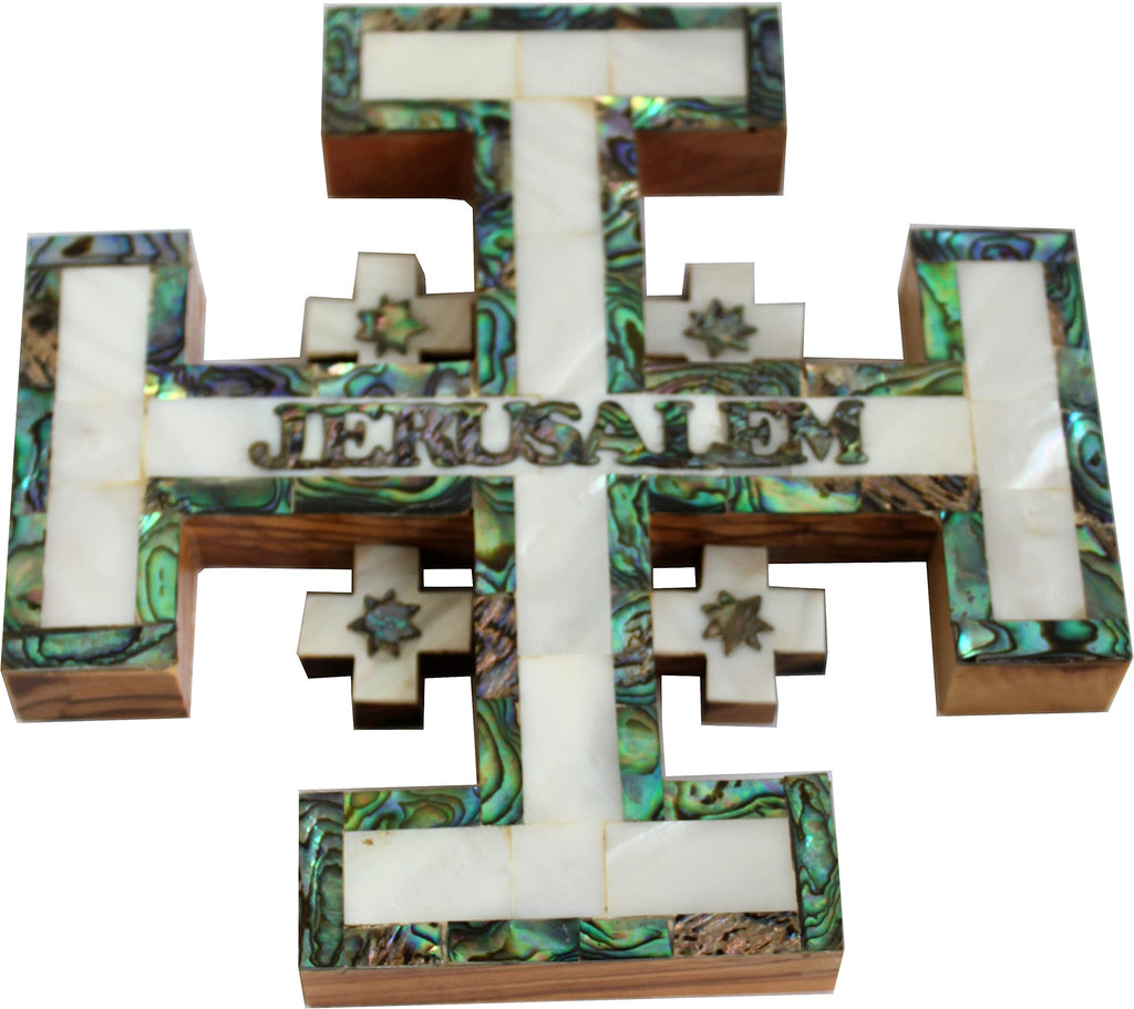 Holy Land Market Olive Wood Jerusalem Cross Covered with Mother of Pearls Shell - Small