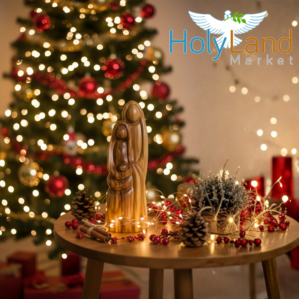 Experience the beauty and peace of the Nativity with this Holy Land Market Hand-Carved Olive Wood Holy Family Statue, lovingly crafted in Bethlehem, the birthplace of Christ. Standing 6.8 inches tall, this modern, smooth-lined sculpture captures Joseph, Mary, and Baby Jesus united in a single flowing formâsymbolizing divine love, family unity, and spiritual protection.
