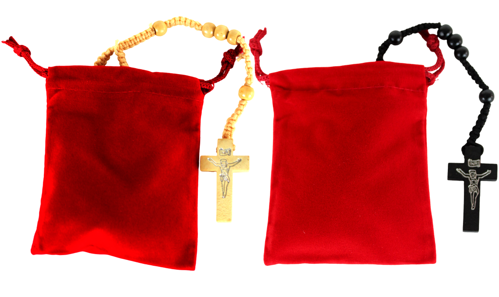 Pair of Black and Beige Wooden Rosaries with Two Velvet Bags - Colored Wooden Beads Rosary Necklaces with Jesus Imprint Cross